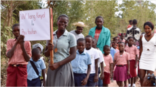 Over 400 advocates took to the streets of Nan Mango in Lagonav to spread awareness about the importance of Haitian Creole as the primary language in schools. Students, parents, teachers and community members marched and chanted while colorful signs and a spirit of change filled the air. Students recited their passionate poems about Creole. The Senfilip e Senjak school won this poetry competition. The LKM community stood proud to see their vision being pushed, celebrated, and validated by the attendance of several local officials.