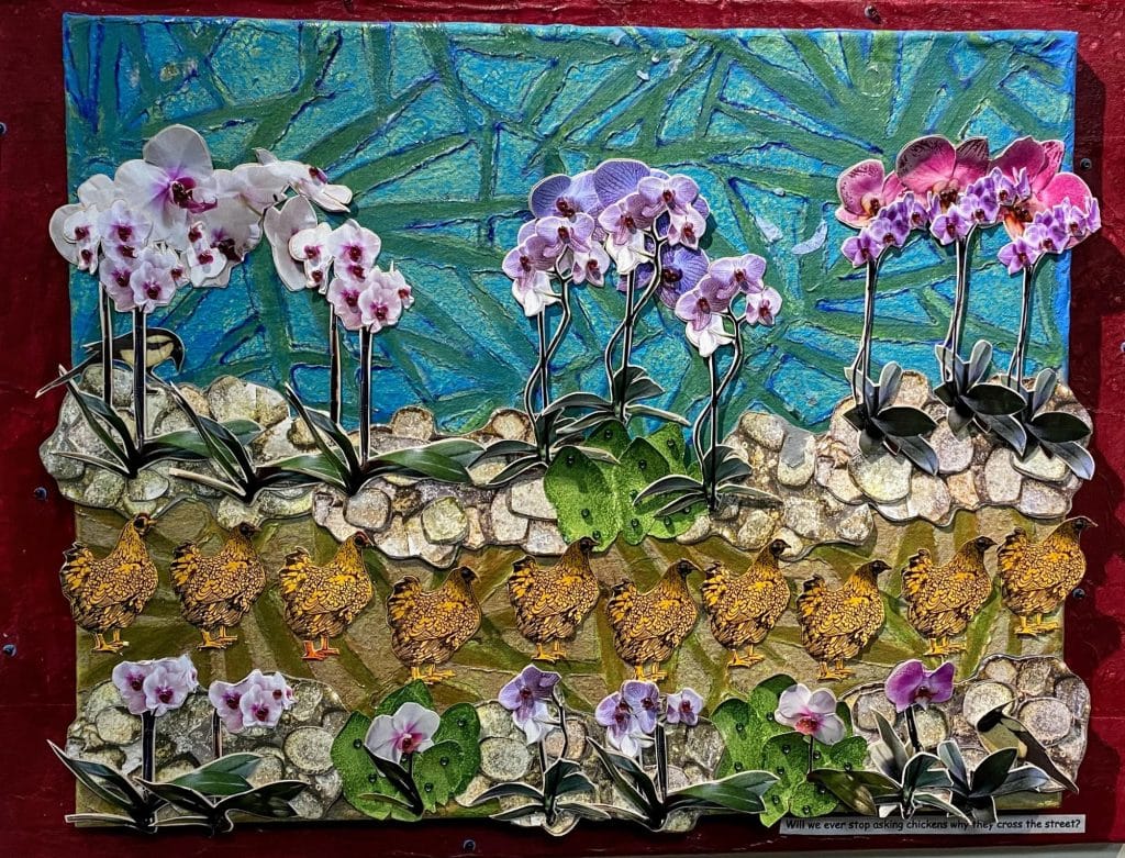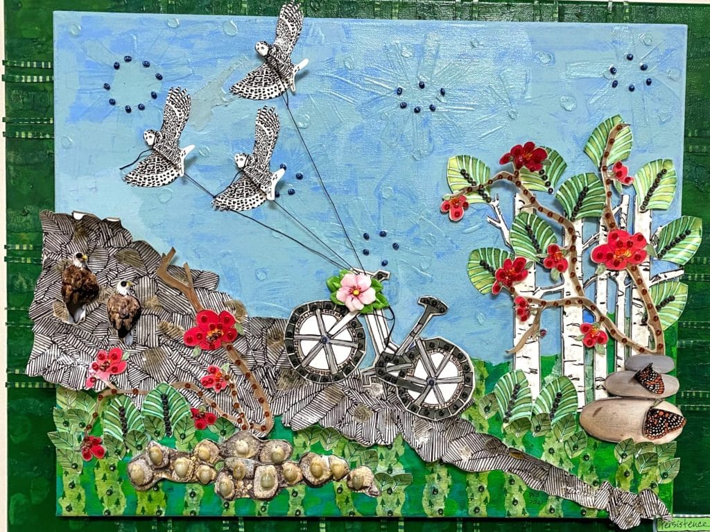 My mixed-media work has expanded my pallet and stretched my creative boundaries, so I now find inspiration from glass, canvas, wood, or cardboard, adding beads, broken or found trinkets, and natural materials. I paint, glue, and cut until my message is clear. “