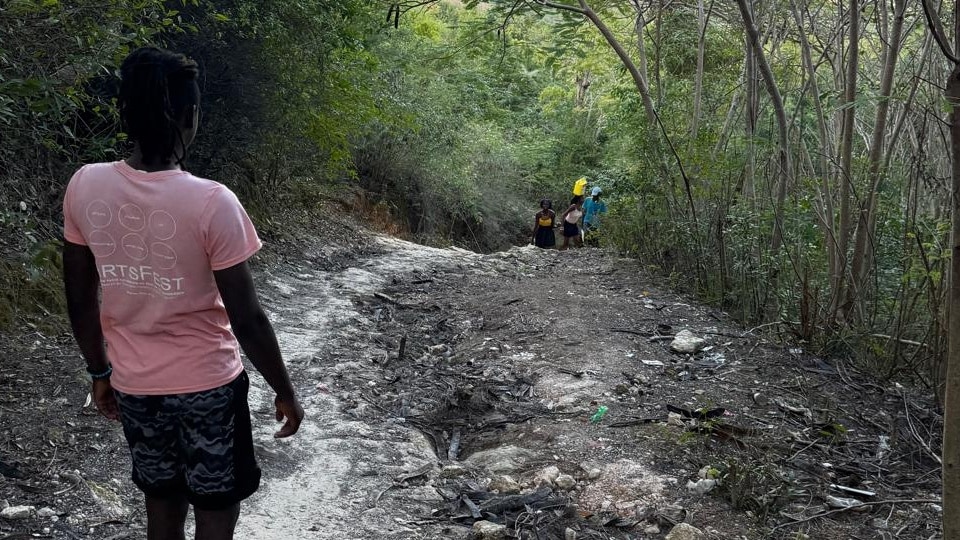 The burden falls most heavily on women and girls, who are primarily responsible for collecting water. About one-third of the households in this area are led by women, making reliable access to water especially important for family stability and safety. (Photo: Local women and girls walk back up the steep and rocky path after collecting water from the spring.)